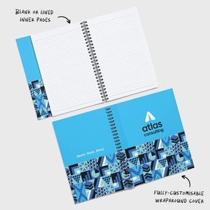 Our A5 wrap notebooks feature a heavyweight, wraparound cover that lets your design flow from front to back. You can even customise the inside of the cover with your contact details, a cheeky quote or a branded message. Plus, the 400 gsm cover and thick pages mean you can bring them everywhere with confidence. Choose a matte cover finish for a glare-free look, glossy for vibrant colours, or natural uncoated for an organic, tactile feel.