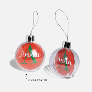 Made from transparent acrylic, our clear baubles can complement any Christmas tree colour scheme or theme. And with 2-sided printing, youâll get double the space to showcase your favourite photos, quotes or artwork â but please note you can only use the same design on each side. Each photo bauble comes with a screw-on cap and silver string, so theyâll arrive ready to hang, and youâll get extra time to sit back and relax (or enjoy your definition of festive fun).